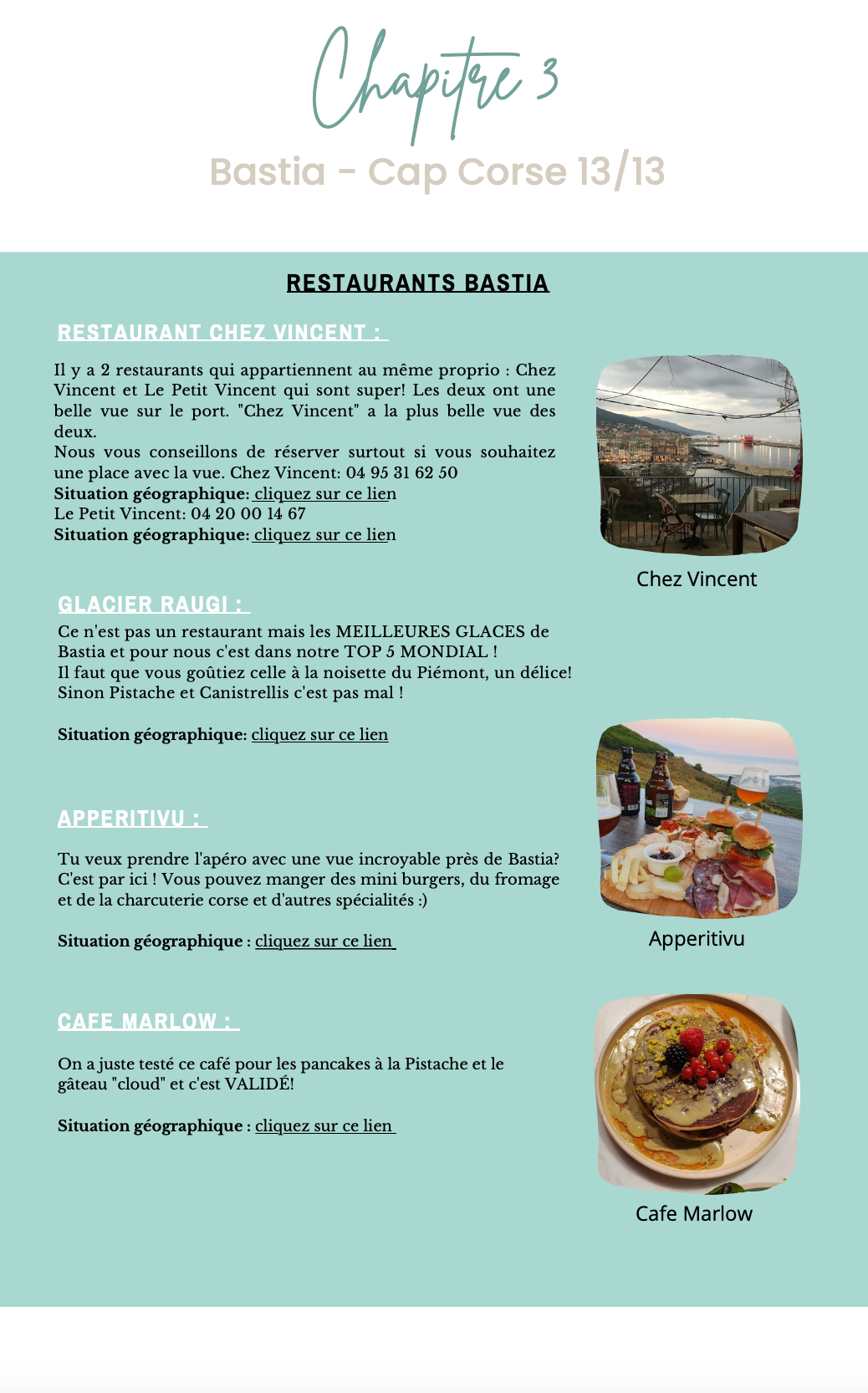 - Des liens de localisation sont fournis pour chaque Hôtel, activité, et restaurant permettront de vous situer sans vous égarer et de les ajouter facilement à vos favoris.